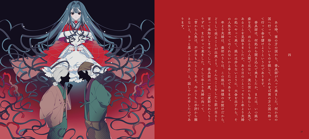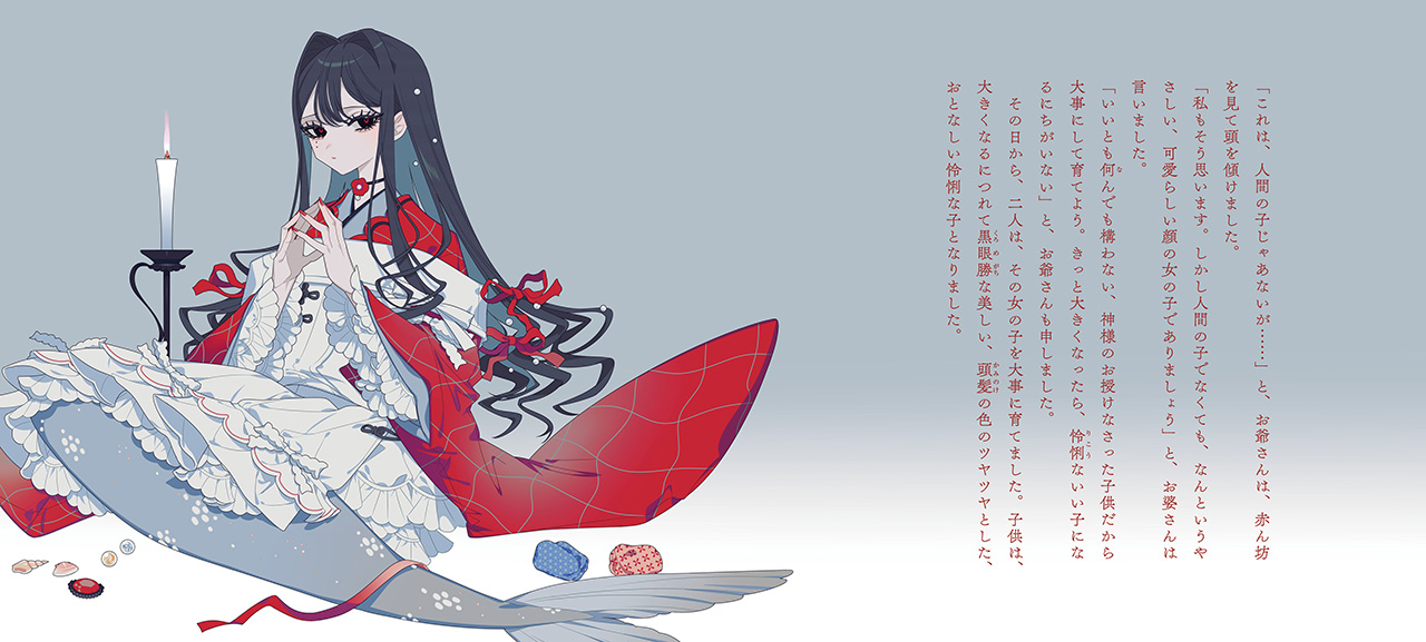 人間に育てられた人魚をめぐる悲しい童話です。昔話のような前半から怪談のような後半への変化を、イラストを通じて楽しんでいただけたら嬉しいです。